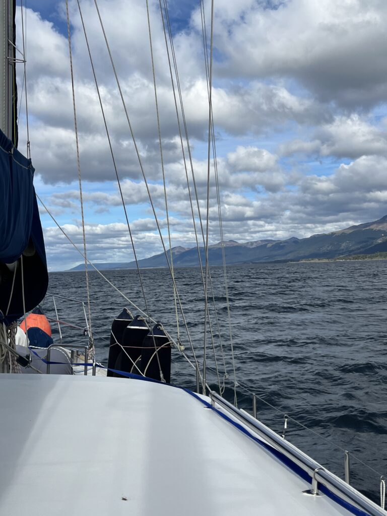 At around half past one, we finally cast off, and the marina office has the audacity to charge us for another day’s fee because we didn’t leave until after 1:00 p.m. They can kiss our ass, we’re not paying anything more. We motor leisurely through the Beagle Channel for 25 nautical miles towards Puerto Williams. Halfway there, we cross the border between Argentina and Chile, which runs through the middle of the channel at this point, and I raise the Chilean flag. This is now the 10th country on our journey.