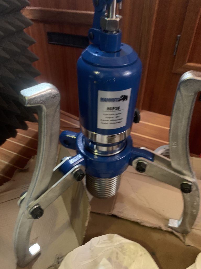 Now it is finally done and all parts are removed from the shaft. With the new hydraulic puller (30t pulling force) it was even quite fast. Now 2 diesel tanks are already cleaned and got a service hatch and our large diesel tank in the engine compartment is pumped out. We have discarded about 400 liters of diesel. In the next few days, we will also install the service hatch here, or possibly two service hatches, and clean the tank. After that, we can continue with the rest of the work. We hope to be able to continue our journey in mid-December.