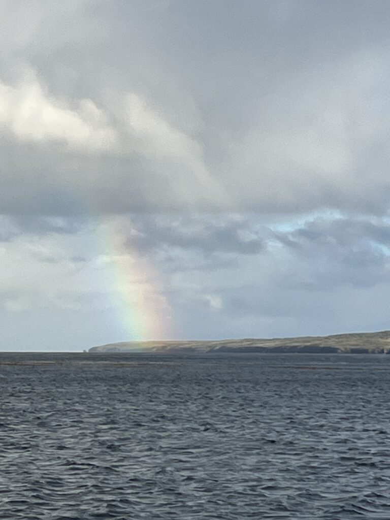 Nachdem das aktuelle Wetter bereits vorgibt, dass wir nicht bis Ushuaia durchfahren können, fällt unsere Wahl für den nächsten Stopp auf die Bahia Thetis. Auf unserem Weg dorthin müssen wir immer wieder mit Windwechseln und daher mit verschiedenen Segelstellungen arbeiten um weiterhin Geschwindigkeit zu machen. Ab und an kommt uns dann auch noch Strömung entgegen, die uns bremst. Ist schon nicht so einfach hier. Aber die seltenen Commerson Delphine, die uns begleiten, reissen es dann wie immer raus. So geht es dahin, mal mit Segeln und Motor, mal nur mit Motor oder Segeln, je nach Wind. Zum Glück gibt es keine große Welle, immer so zwischen 1-2m und das Wetter passt auch einigermaßen, bis sich plötzlich seitlich von uns eine schwarze Wand aufbaut. Zum Glück sind unsere Segel schon gerefft (verkleinert), wir hätten keine Zeit mehr gehabt, so schnell wie diese Unwetterzelle uns erreicht. Mit bis zu 45kn(83kmh) in den Böen geht mal kurz die Welt unter. Wir sind auf einem Halb Wind Kurs (Wind 90 Grad von der Seite) unterwegs und das Boot krängt (hat Seitenlage) mit 25-28 Grad. Ein bisschen gruselig ist es schon, aber auch total beeindruckend, wie unsere Amber mit Autopilot da durch schießt, mit der Hand hätte ich das nicht Steuern wollen 😵💫. So schnell wie es gekommen ist, verzieht sich das Unwetter auch wieder und der Spuk ist vorbei. Den Rest des Weges legen wir in Ruhe zurück und um 06:40 an diesem Morgen, nach 640sm, fällt der Anker in der Bahia Thetis. Auch diese Bucht ist sehr schön und um uns herum nur Natur pur. Da die Wetter und Wind Vorhersage nicht wirklich optimal ist, beschließen wir, uns hier nicht zu lange aufzuhalten sondern am nächsten Tag sehr früh wieder zu starten. Als dann um 4:00 der Wecker klingelt, schaffen wir es tatsächlich nicht uns aufzuraffen. Offensichtlich fordert die zurückliegende Strecke doch einen gewissen Tribut. Wir drehen uns nochmal um und verschieben die Abfahrt um einen Tag. Die Konditionen verbessern sich damit nicht, aber hinterher ist man immer schlauer. Den zusätzlichen Tag nutzen wir zum Ausruhen, Vorkochen und Brotbacken. So heisst es dann am 19.01. Anker auf und schon gibt es die erste Schwierigkeit. Hier in dieser Gegend gibt es sogenannte Kelpfelder. Kelp ist eine zähe Braunalgenart, die waldähnlich am Meeresboden wächst und eine Höhe von bis zu 60m erreichen kann. Man sollte tunlichst vermeiden mit den Boot dort hineinzufahren oder den Anker dort zu plazieren, da sich der Kelp im Propeller oder Anker verfangen kann und dann heraus geschnitten werden muss. Im Regelfall bedeutet dass, das jemand von der Crew ins Wasser muss. Die Temperaturen laden hier definitiv nicht dazu ein 🥶. Als also unser Anker freigebrochen ist, lässt sich das Boot auf einmal nicht mehr nach rechts steuern. Irgendwas blockiert, aber wir haben Glück. Was immer es ist, es lässt sich mit ein paar energischen Ruderbewegungen lösen. Das Ruder bleibt zwar weiterhin nach rechts schwergängig, aber wir können das Boot wenden und die Bucht verlassen ohne in ein Kelpfeld zu fahren 😅. Draussen stoppen wir und gehen der Sache auf den Grund. Der Steuerzug rechts hat sich gelöst. Ist nicht neu, hatten wir schon und lässt sich beheben. Die Belastung von Wind und Welle der vergangenen Tage macht sich auch beim Material bemerkbar.