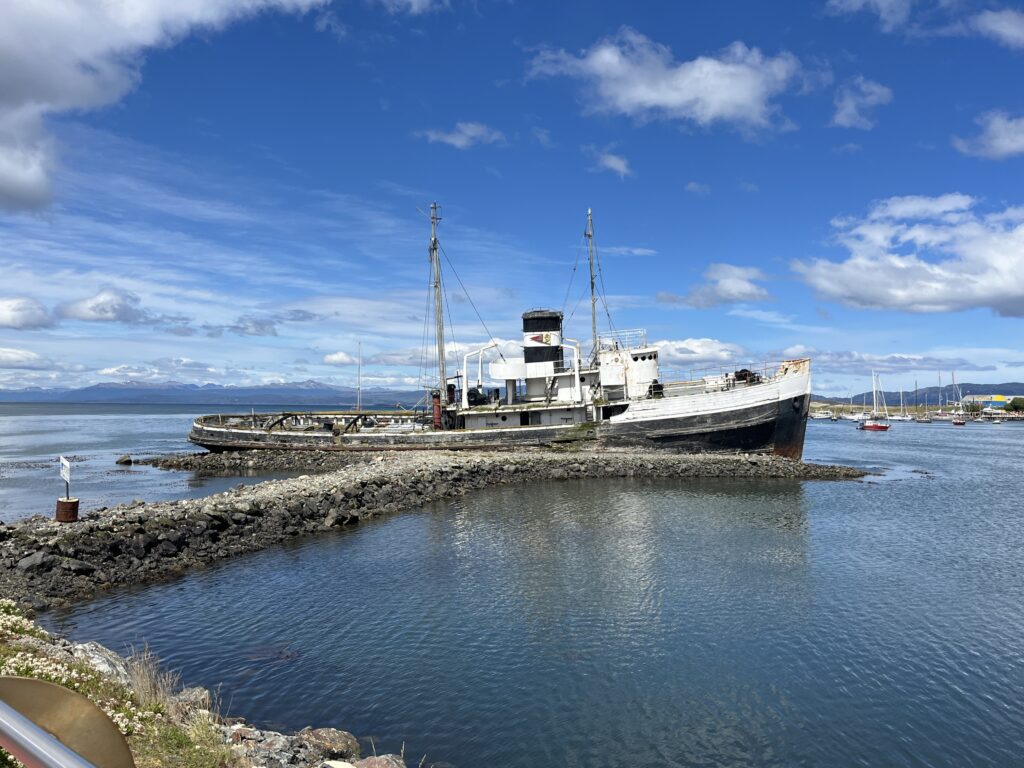 Now we begin the somewhat challenging part of the route into the Beagle Canal, the Le Maire Strait. Here, you have to pay close attention to the wind and tidal currents, otherwise you may not make it through and around the corner into the Beagle Canal. We have researched and calculated everything carefully, so we are confident that we will make it safely to our next bay, Puerto Espanol. However, we can’t dawdle, so we mostly motor-sail to maintain the necessary speed and keep the current with us. As always, our calculations don’t quite add up and we are slowed down again and again, but in the end it all works out. We pass Isla Grande de la Tierra del Fuego and suddenly I see it – whale spouts. I can’t believe it. A group of orcas has gathered here to hunt seals and penguins. Thankfully, they are not interested in sailboats. We can see humps and fins, but unfortunately they are too far away to capture on camera. I’m happy, as I’ve always wanted to see whales. Penguins also swim past the boat from time to time. It’s just fantastic. Full of new impressions, we reach Puerto Espanol shortly after 7 p.m. and drop anchor. After two days, we continue 56 nautical miles to Bahia Harberton. Here, there is something resembling civilization again, and the bay is well protected. Gradually, time is dragging for us now and we are looking forward to Ushuaia and our first hot shower in three weeks 😉. After all, we have now been underway for 16 days without going ashore. After a short night in Harberton, we set off early the next morning for our last leg in the Beagle Canal. On the way, we stop briefly at Isla Martillo, the penguin island, to visit the Magellanic penguins. And then we finally head straight to Ushuaia, the southernmost city in the world. At 12:30 p.m., after 37 nautical miles, we dock there and are greeted with a warm welcome from Roxanna. As the first Austrian boat in years and the first TransOcean boat this year, we are happy and proud that we made it – what an honor 😀. For today, all that’s left to do is deal with the bureaucracy and take our first walk in the city. What immediately strikes us is the number of cruise ships and commercial sailing ships that transport guests to Antarctica. Accordingly, the place is very touristy and expensive. Nevertheless, the landscape is breathtaking, and after our usual boat work, we will certainly use the rest of our time to explore the area. Later, one of Skip Nowak’s two ships docks right behind us. It’s amazing who you meet here 😀.